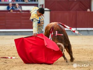 " href="https://toreoyarte.com/glossaire/ruedo/" target="_blank" data-mobile-support="0" data-gt-translate-attributes='[{"attribute":"data-cmtooltip", "format":"html"}]' tabindex="0" role="link">ruedo. Quite par chicuelinas et larga toreras de Castrejón.  Le jeune Pedro Gómez se charge du second tiers avec un premier passage à faux, bâtons en main, une seconde pose al cuarteo cuarteando après un Mouvement de cape, de muleta ou du corps qui consiste à modifier avec une intensité variable la direction de charge du toro afin de la freiner ou de la réduire.