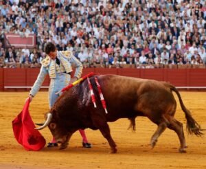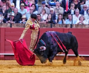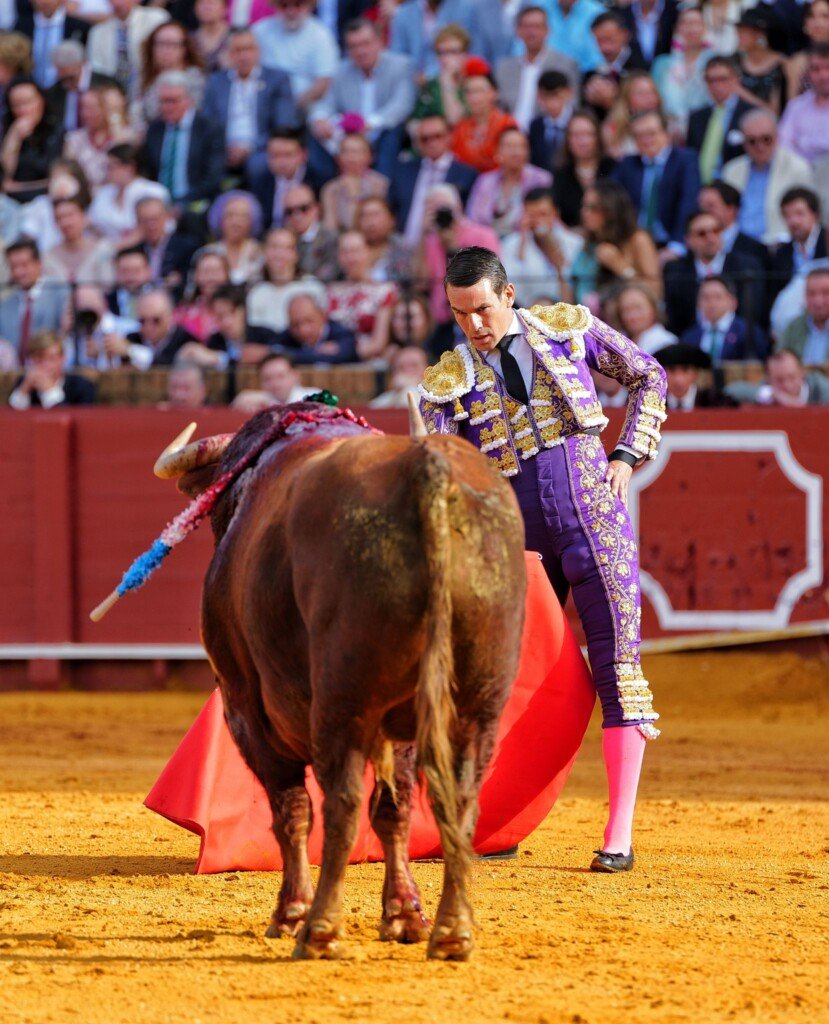 Les véroniques de Daniel Luque, à son premier, lavado de cara, sont poussées, brusques, sur la corne gauche à cause du vent. Face à l’épreuve du fer le cuvillo hésite d’abord, puis pousse, a menos, longuement en deux rations de piques bien portées. Les banderilleros Juan Contreras et Jesús Arruga, mis à l’épreuve par un animal pensif, saluent après avoir été poursuivis vers les tablas. Daniel Luque démarre son trasteo face à un animal qui gratte le sol et trébuche en avançant au pas. Avec aguante, le matador montre son habituelle fermeté. Le vent gêne mais Luque enroule à droite sans perdre de terrain. La charge du toro est molle. Luque fait l’effort de placement sans abuser des cites por fuera dans un trasteo sérieux, surtout du côté gauche. Un arrimón final, sans bouger, convainc la Maestranza. Des mondeñinas serrées précèdent une épée trasera, contraire, verticale et atravesada portée avec engagement. Oreille. Quelques palmas au toro.