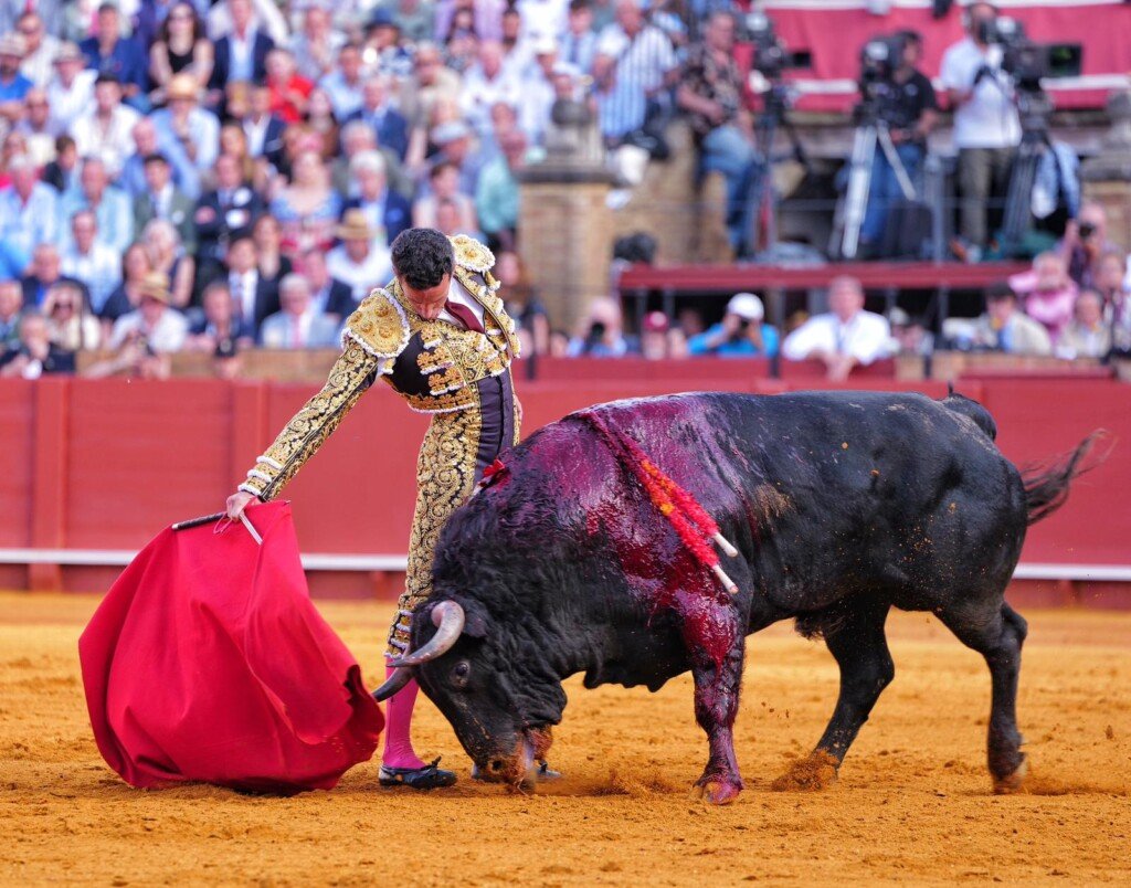 Le sixième, burraco, est reçu par véroniques, pieds joints, jusqu'à ce que le toro accroche la cape avec la corne droite. Suivent de nouvelles véroniques et la demi-véronique. Le toro est piqué avec mesure, une fois, puis al relance dans un tercio de varas mené bon train. Le bicho trébuche à plusieurs reprises dévoilant une febrilité des antérieurs. Aux tercios, David de Miranda "cite" pour des ayudados por alto, pase del desprecio et pase del pecho qui font réagir Séville. Il "cite" de loin pour une serie courte à droite, en ligne et sans peser. Musique. Dans la suivante, il se replace en reculant entre les muletazos et garde la muleta à mi-hauteur. A gauche, il expulse la charge mais n’évite pas les fléchissements de l’adversaire. La toupie fait de nouveau son effet sur le conclave. De retour à gauche viennent deux naturelles profondes, le toro protestant dans la troisième gauchère, mais le torero corrige dans le remate. Une série à droite liée, avec la passe de poitrine fait l'unanimité. Quelques mondeñinas millimétrées déclenchent très justement une ovation. Entière desprendida. Petition majoritaire des deux oreilles. Une seule est accordée.