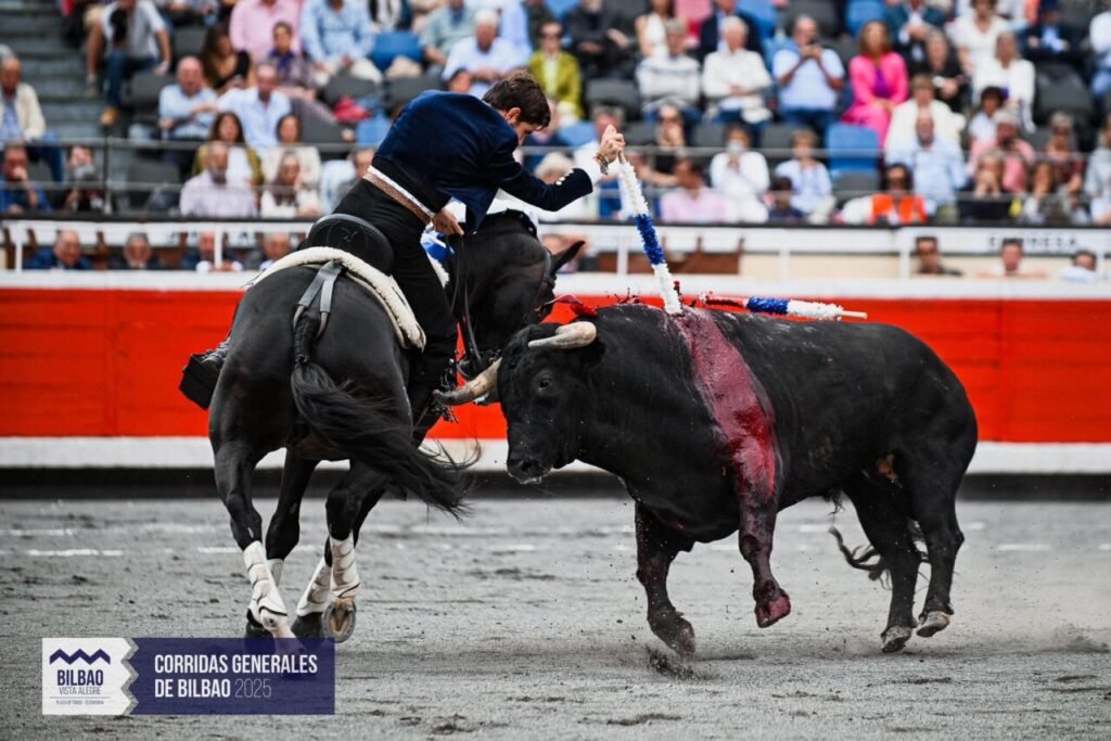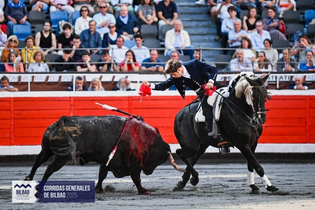 Borja Jiménez renforçait sa réputation à Bilbao en signant deux faenas volontaires avec le point culminant de celle au 6ème. À son premier, sans transmission, faible de surcroît et peu piqué par “Tito” Sandoval, tête en l’air typique des santa-coloma en fins de passes, il devait abréger sa faena... L’estocade était d’effet rapide sans trop savoir quel était son placement…  Le dernier de La Quinta n’était pas trop châtié, la pique étant rapidement relevée et répondait au quite par chicuelinas, quelconques, d’Emilio de Justo. À la muleta, Borja “citait” depuis le centre du